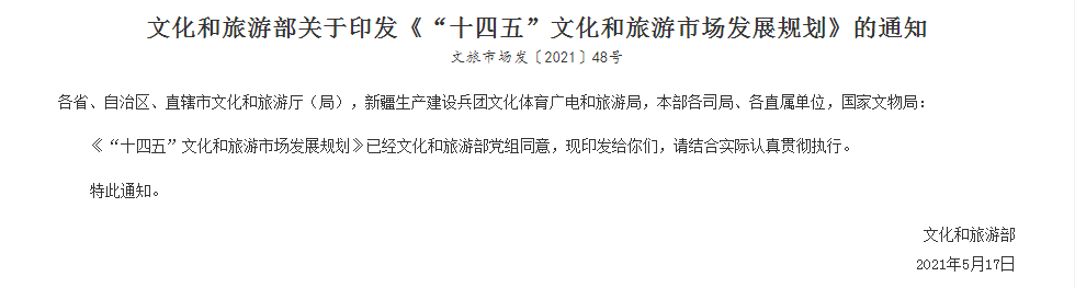 2021年6月4日,文化和旅游部发布《“十四五”文化和旅游发展规划》