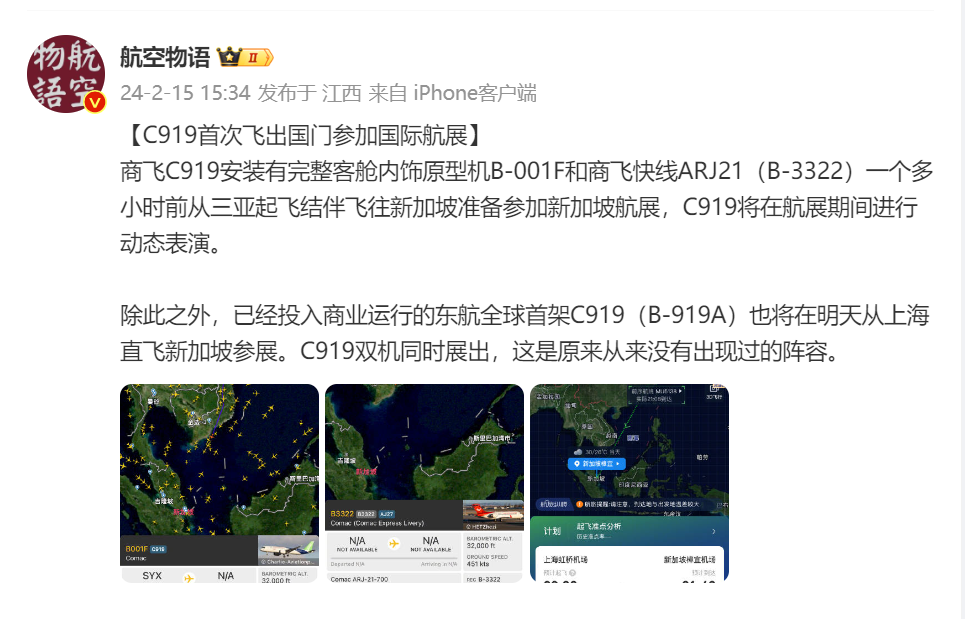 商飞C919原型机B-001F和ARJ21(B-3322)已从三亚飞往新加坡准备参加新加坡航展,C919将在航展期间进行飞行表演。