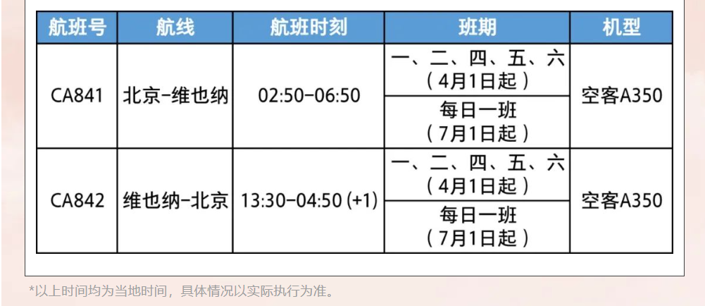 2024年4月1日起,国航北京首都-维也纳航线将增加至每周5班,航班号为CA841/2,由空客A350执飞。自2024年7月1日起,更将增至每日一班,为您出行提供更多选择。