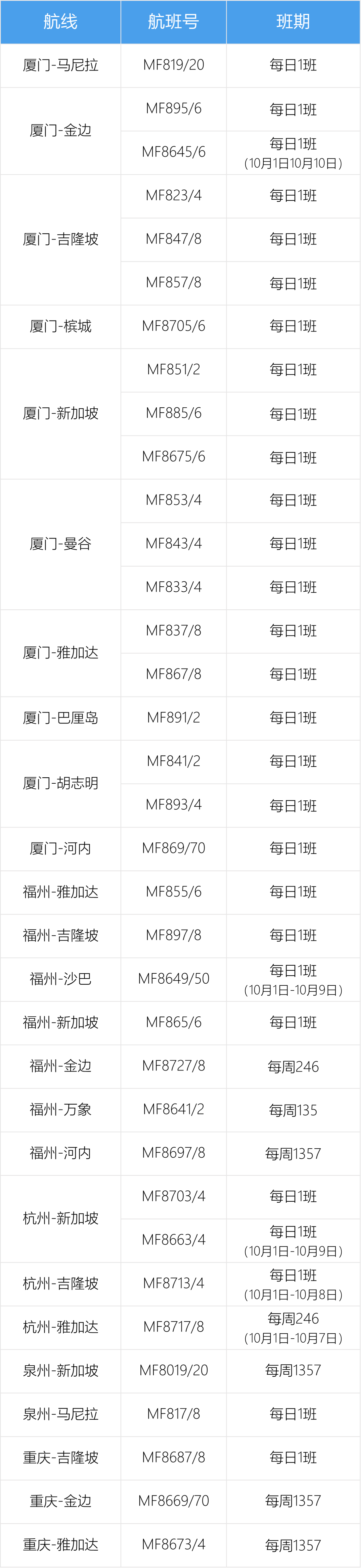 厦航发布2025年10月国际及地区航班信息,执行周期为10月1日-10月25日。10月26日新航季即将开启,敬请期待。