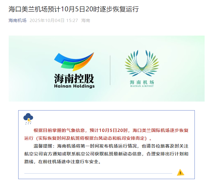 海口美兰机场发布公告:根据目前掌握的气象信息,预计10月5日20时,海口美兰国际机场逐步恢复运行(实际恢复时间及航班将根据台风动态和航司安排而定)。