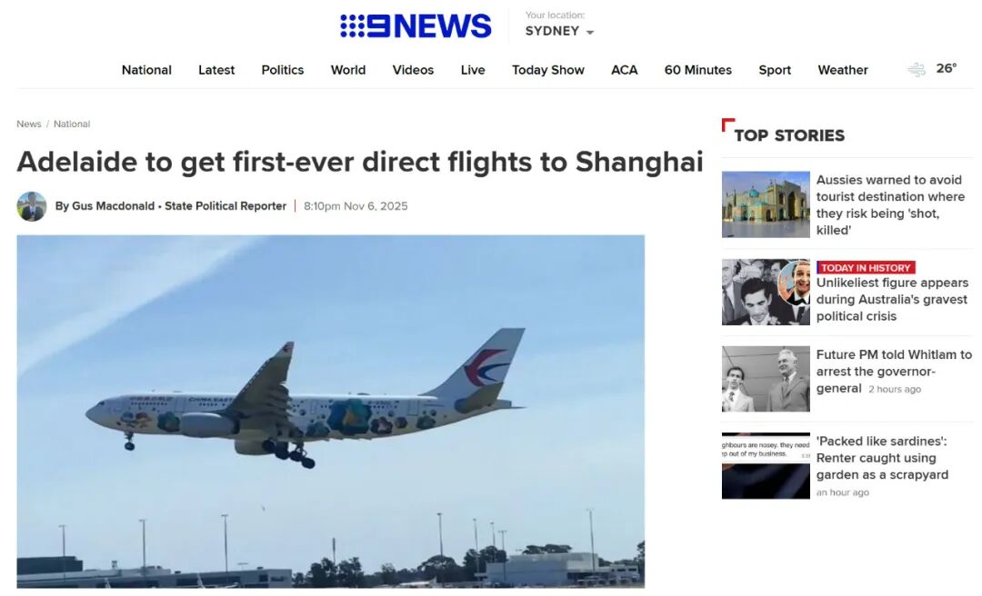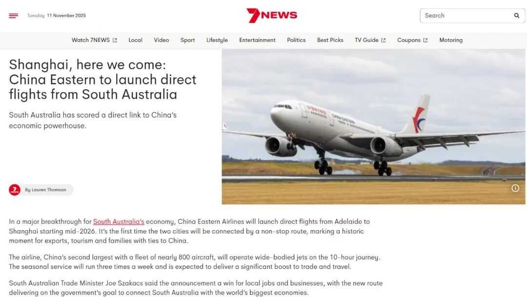 7NEWS报道称中国东航将于2026年中起开通阿德莱德直飞航班,这对于南澳经济来说将是一项重大突破。东航的阿德莱德-上海航线将是两个城市之间首次直连航线,对南澳对中国出口、旅游等是一个历史性时刻。