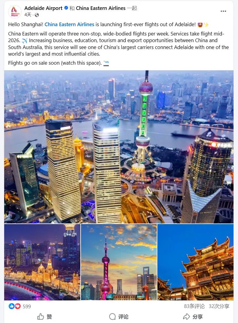 阿德莱德机场更是在其社交媒体平台上宣布,新航线“很快”将会开放预订。它在帖子中表示:“你好上海!中国东方航空将有史以来首次开飞阿德莱德!”