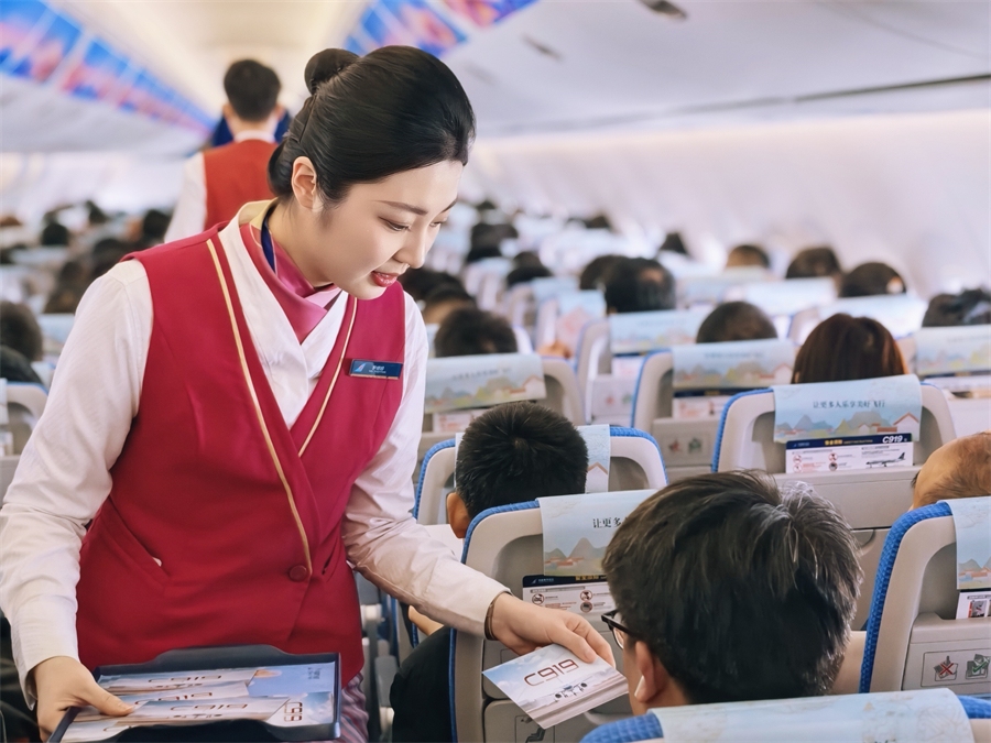 南航C919飞机采用164座三舱布局,包含8个公务舱座位、18个明珠经济舱座位和138个经济舱座位,飞机装配了定制化的客舱座椅等设施设备,全舱配置个人充电接口,为乘客提供便捷舒适的乘机体验。