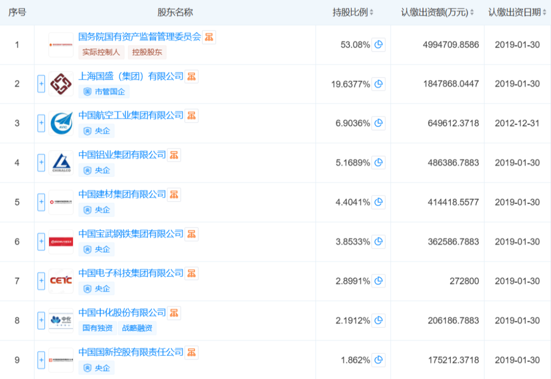 中国国新控股有限责任公司、中国中化股份有限公司、中国航空工业集团有限公司、中国宝武钢铁集团有限公司、上海国盛(集团)有限公司这5家股东的持股比例有所下降。