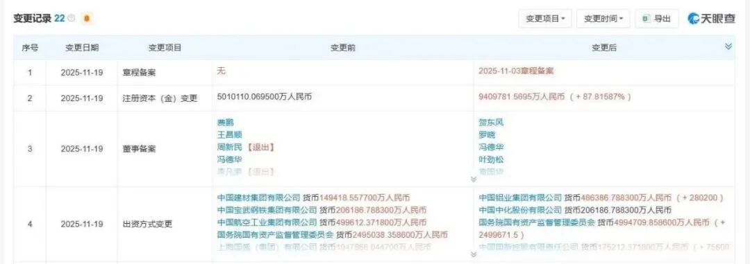 据天眼查App显示,近日中国商用飞机有限责任公司发生工商变更,注册资本由约501.01亿人民币增至约940.98亿人民币,增幅约88%。