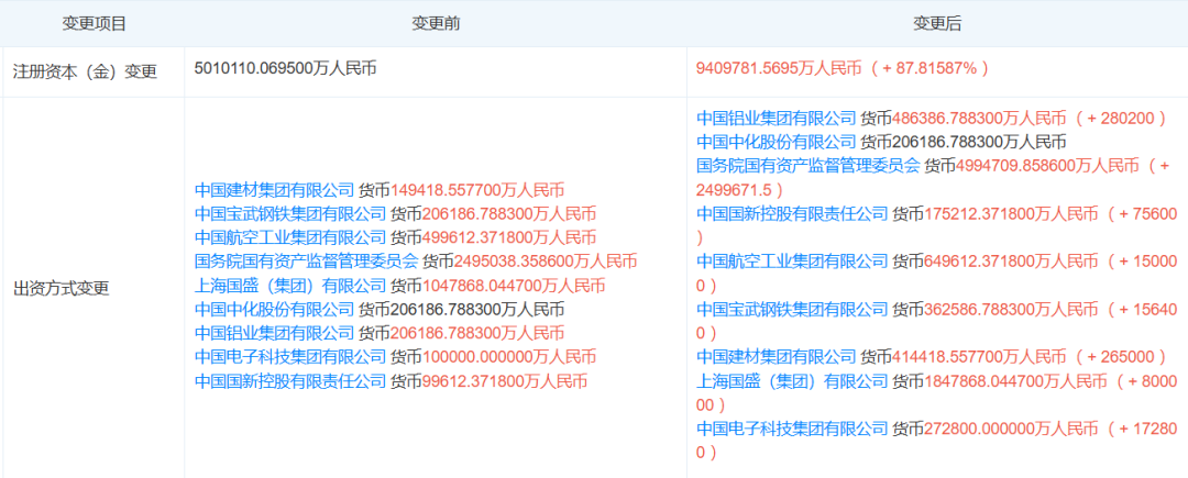 从具体增资来看,仅中国中化股份有限公司没有增资,其余8家股东全部进行了增资。其中,国务院国有资产监督管理委员会增资金额最高,达247.97亿元,持股比例由49.8%增至53.08%。