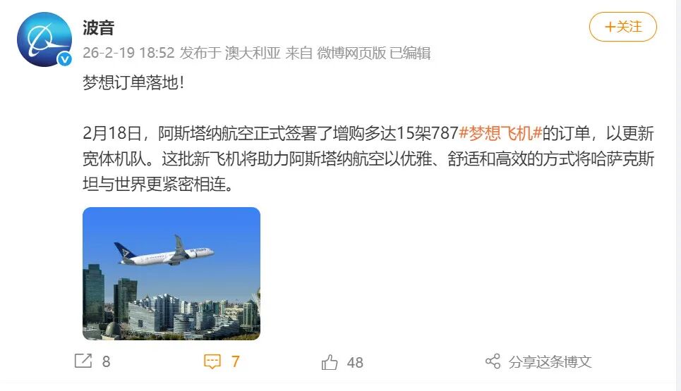 据波音微博消息,2月18日,阿斯塔纳航空正式签署了增购多达15架787梦想飞机的订单,以更新宽体机队。