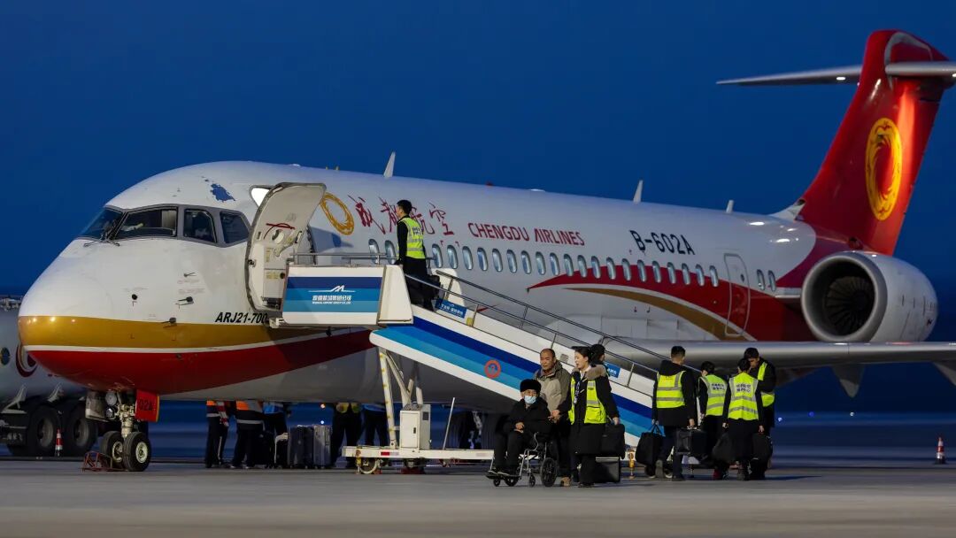 2月1日,吐鲁番机场,一架成都航空的C909飞机前,工作人员正协助轮椅旅客下机。作为国产支线客机,C909在新疆地区的运营为各族群众的出行提供了便利(记者汪洋/摄)