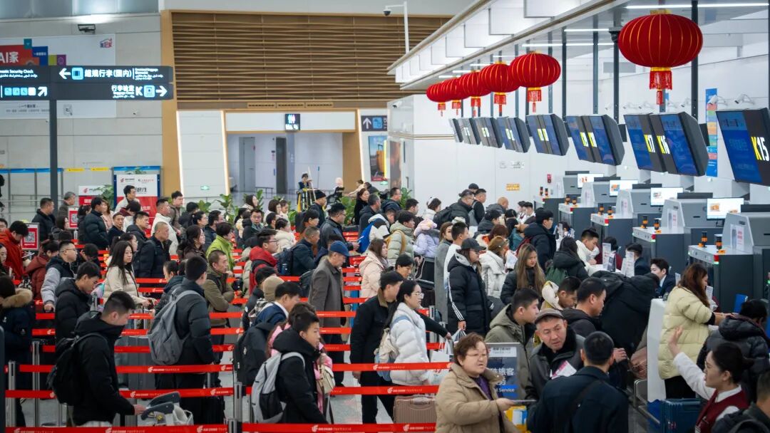 2月2日春运首日,乌鲁木齐天山国际机场航站楼,旅客们正有序排队办理值机手续(记者汪洋/摄)