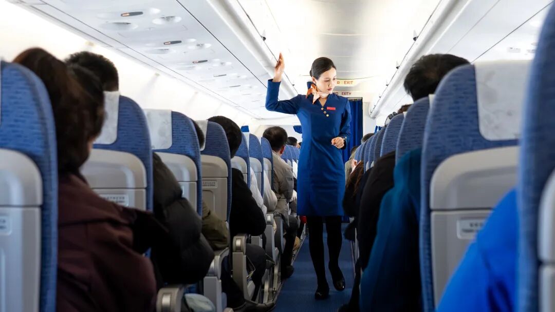 2月2日,成都航空EU2939航班客舱内,乘务员迪丽热巴正在进行降落前安全检查(记者汪洋/摄)