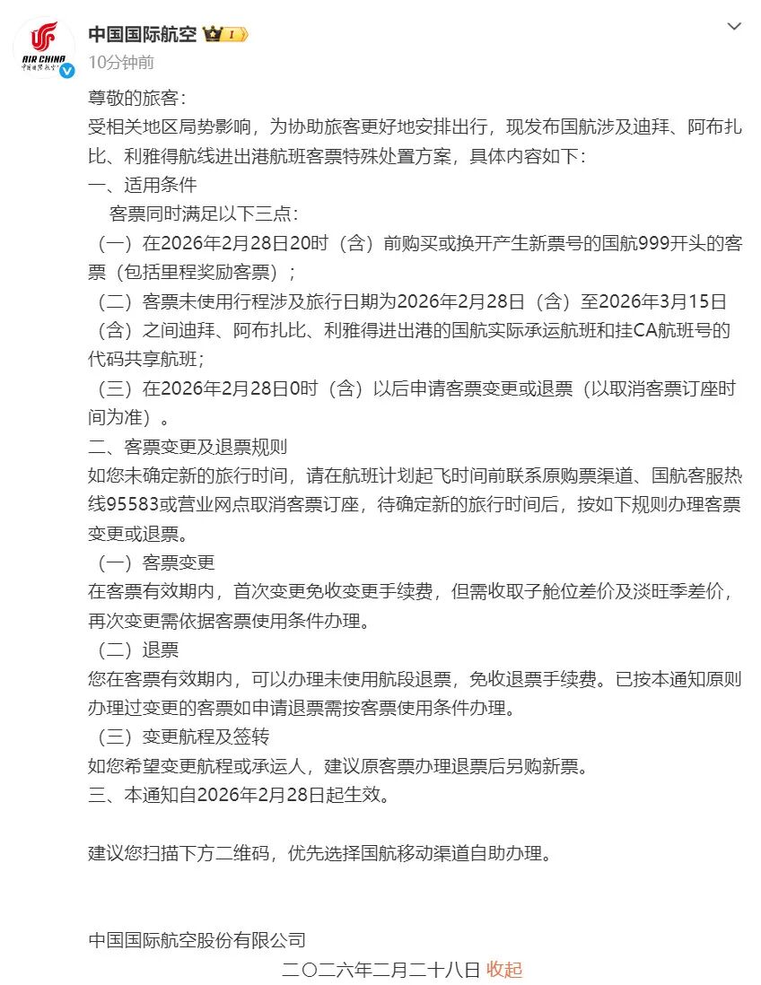受相关地区局势影响,为协助旅客更好地安排出行,现发布国航涉及迪拜、阿布扎比、利雅得航线进出港航班客票特殊处置方案,具体内容如下: