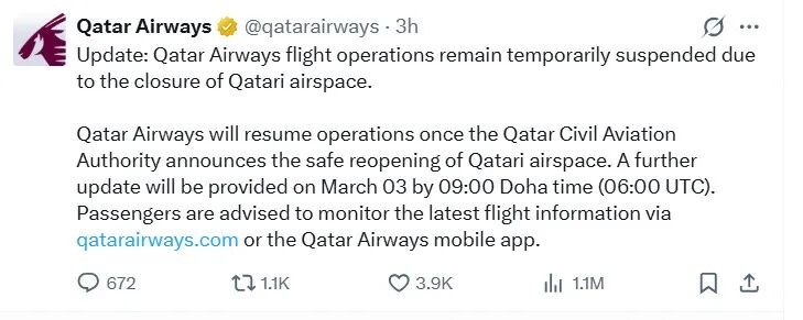 印度航空已暂停印度与阿联酋、卡塔尔、以色列和沙特阿拉伯之间的航班,直至当地时间3月2日23:59。同样,靛蓝航空也已取消飞往中东的航班,直至3月3日,而其飞往欧洲(雅典、曼彻斯特、伦敦和阿姆斯特丹)的航班由于空域关闭,仍将取消至3月2日。