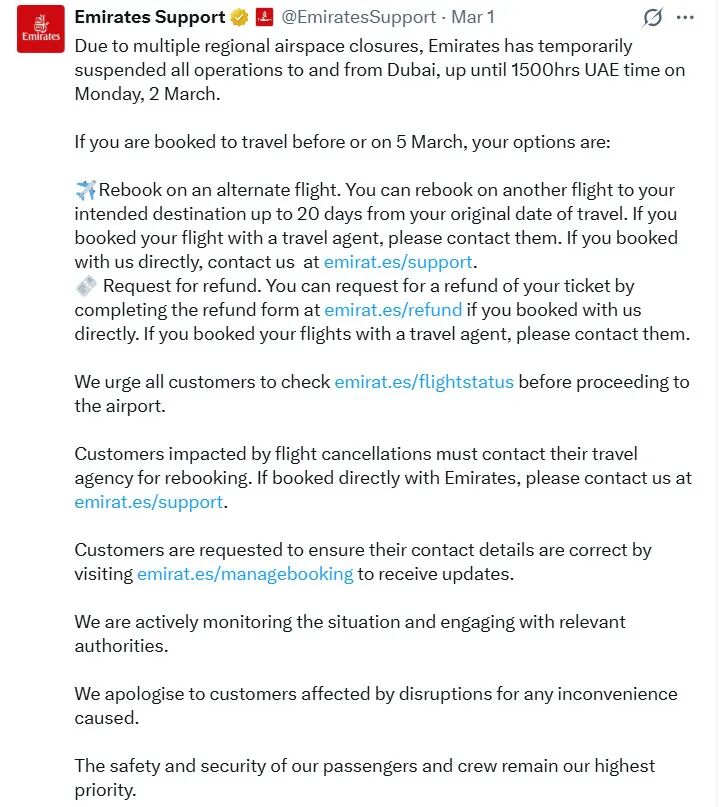 阿联酋航空暂停了所有往返迪拜的航班运营,直至阿联酋时间3月2日星期一下午 3 点。