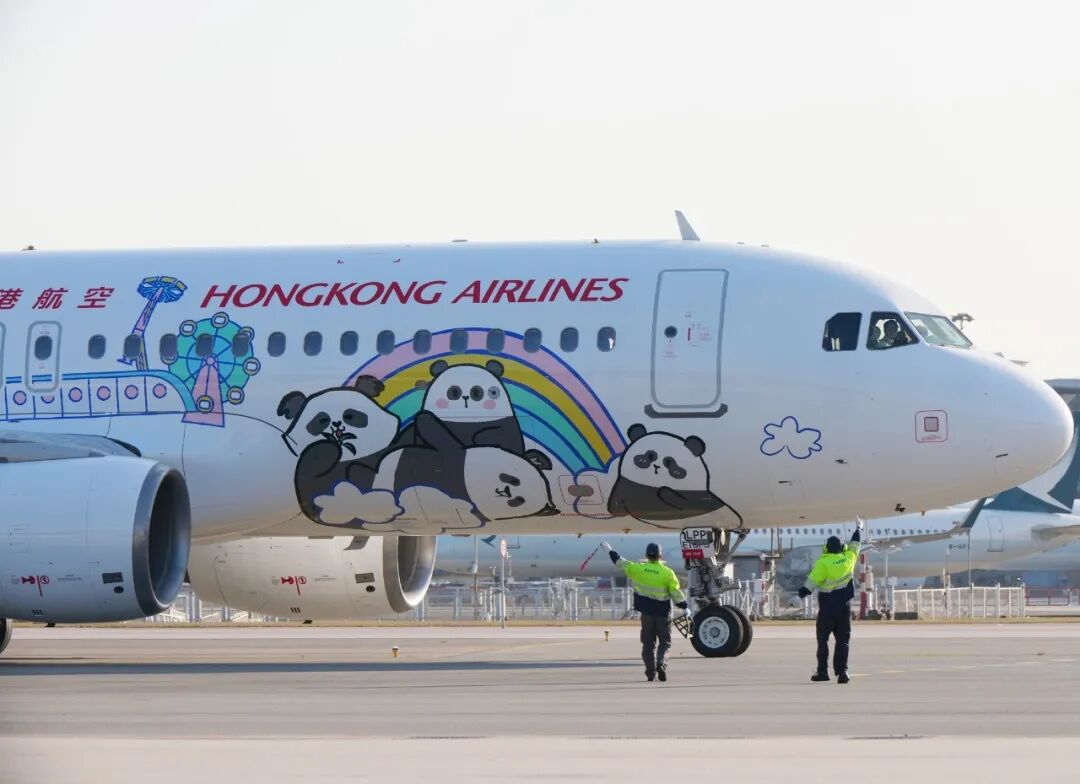 香港航空联同香港海洋公园推出全新“Panda Friends”熊猫主题彩绘客机,正式飞抵香港国际机场。这是港航扎根香港二十年来首款特别涂装,也揭开了品牌新视觉的序幕。