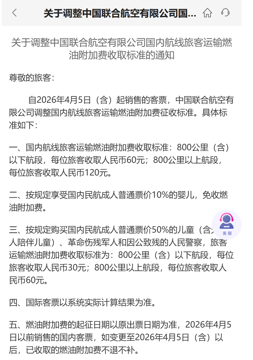 自2026年4月5日(含)起销售的客票,调整国内航线旅客运输燃油附加费征收标准。具体标准如下: