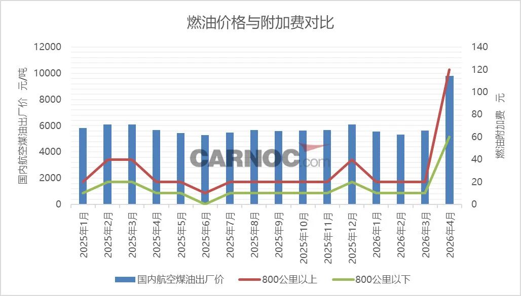 业内普遍认为,受近期国际油价上涨影响,航空煤油采购成本攀升,触发了燃油附加费联动机制。据隆众资讯消息,4月份航空煤油出厂价格由5622元/吨调整为9802元/吨,上涨了4180元/吨。