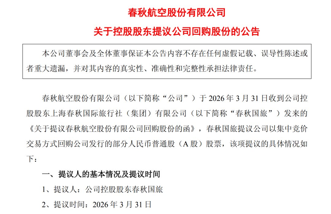 同日,春秋航空再发布公告,公告称于2026年3月31日收到公司控股股东春秋国旅发来的《关于提议春秋航空股份有限公司回购股份的函》,春秋国旅提议公司以集中竞价交易方式回购公司发行的部分人民币普通股(A股)股票,回购股份的资金总额为不低于人民币3亿元(含),不超过人民币5亿元(含)。