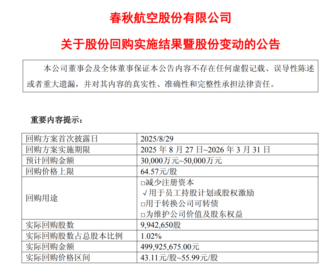 4月1日,春秋航空发布关于股份回购实施结果暨股份变动的公告,2025年11月20日,公司通过上海证券交易所交易系统以集中竞价交易方式首次回购公司股份35,800股。