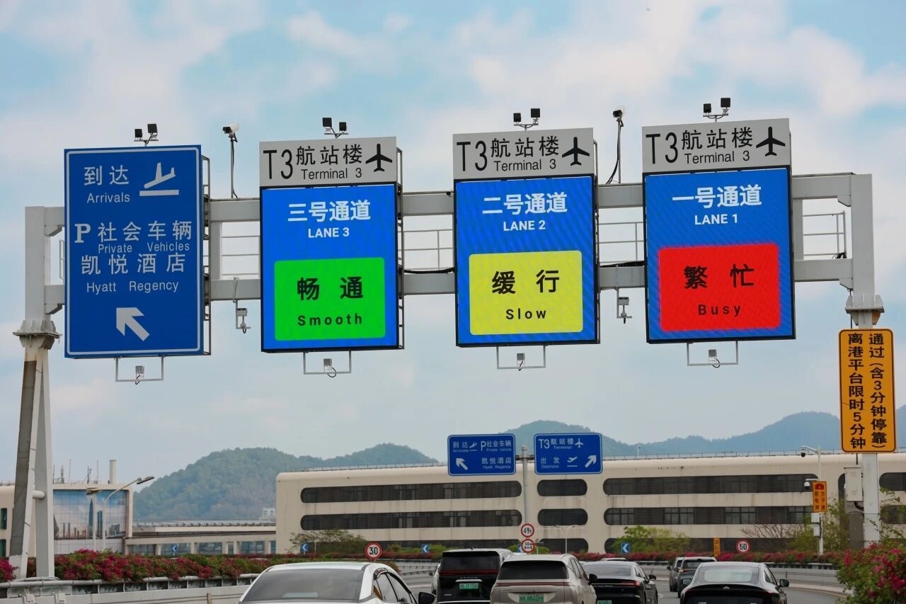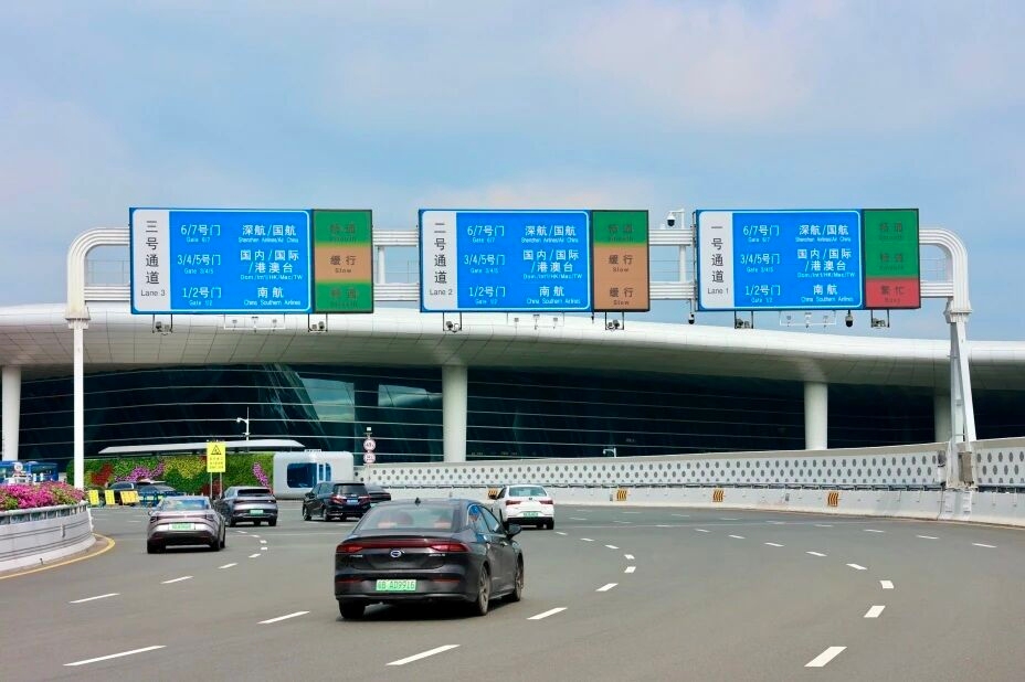 近期,多级智慧信息引导系统在深圳机场抵近航站楼离港平台的领航高架路段正式启用。