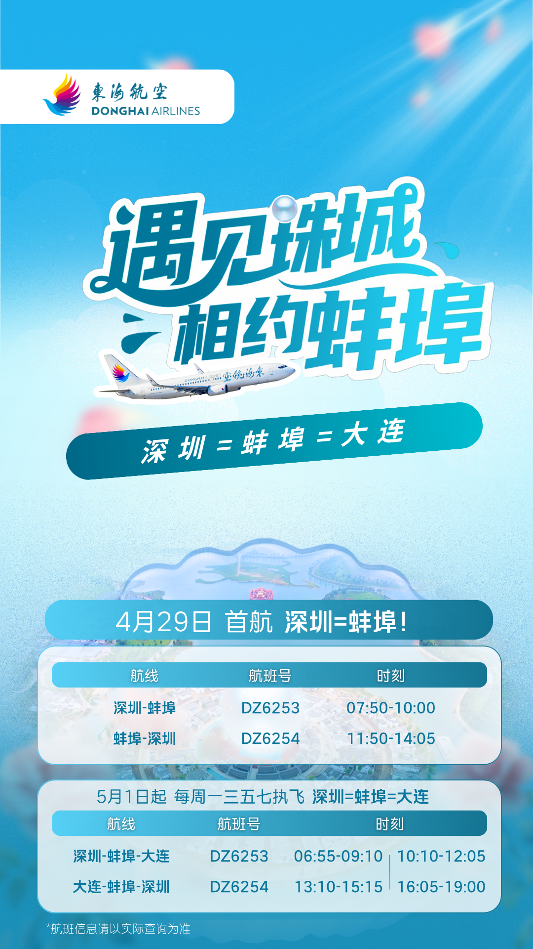5月1日起,每周1/3/5/7,东海航空将正式执飞DZ6253/4深圳=蚌埠=大连往返航线。