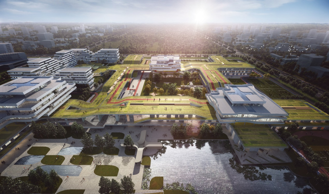 新校区建筑屋顶结构取机场跑道之形,将所有建筑单体首尾连贯、流畅衔接,形成巨构综合体,呈现出极具民航特色的建筑美感。