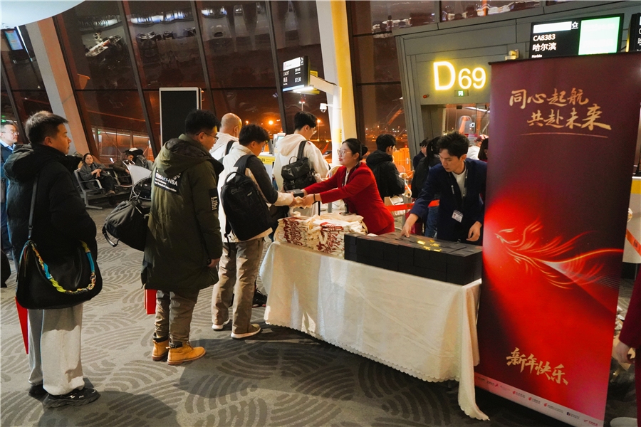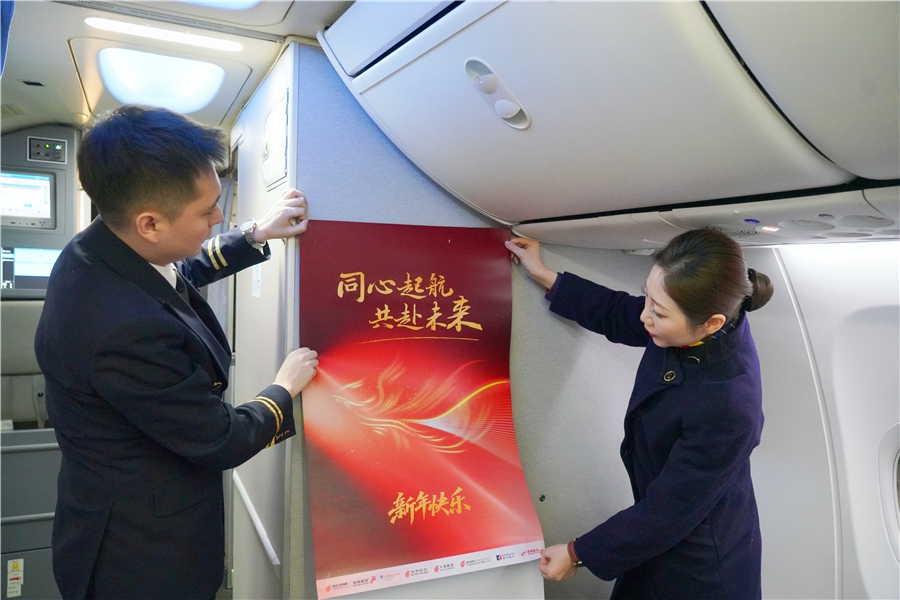 当天,所有主题航班的客舱均经过精心装饰,“同心起航·共赴未来”的主题视觉贯穿始终,营造出浓厚的节日氛围。航班进入平飞阶段后,热情洋溢的机长广播在客舱中响起,为旅客们送上温馨诚挚的新年祝福。旅客还获赠了具有各航司特色的伴手礼,让这份独特而温暖的新年飞行体验成为值得珍藏的记忆。