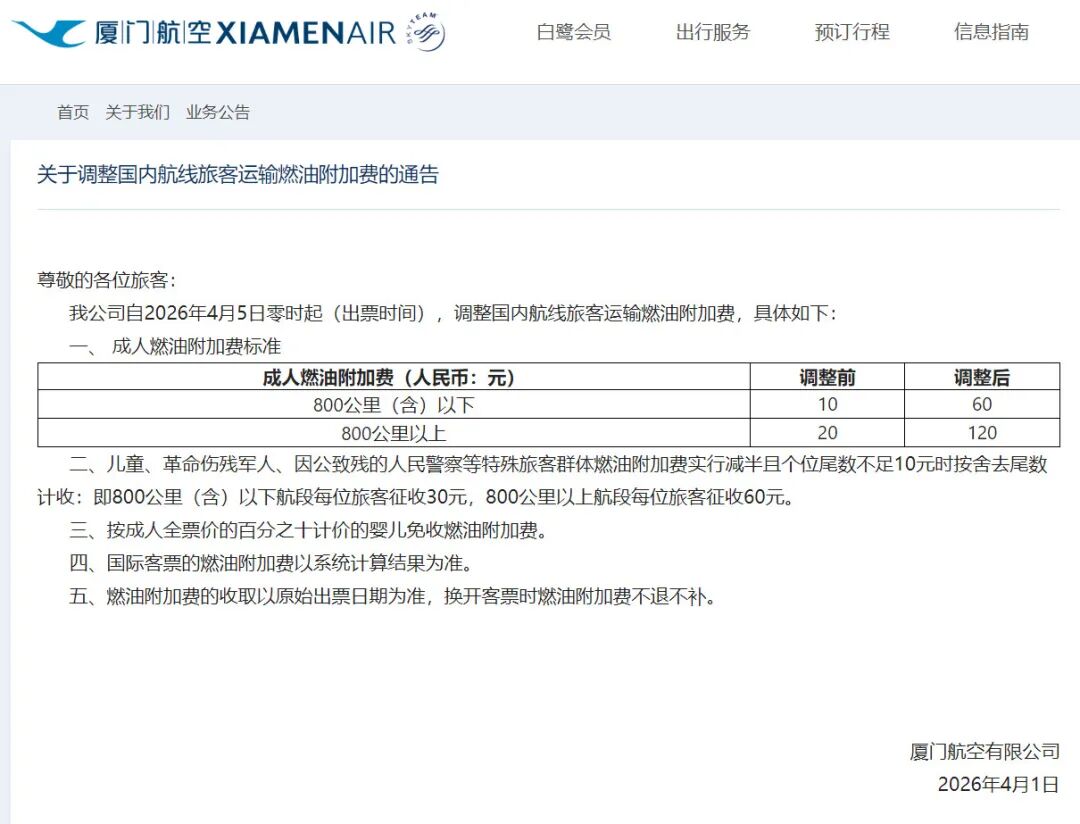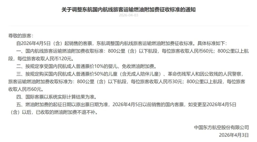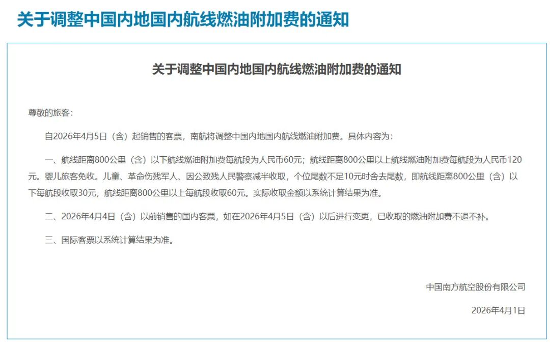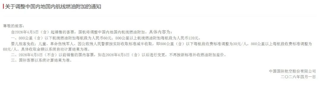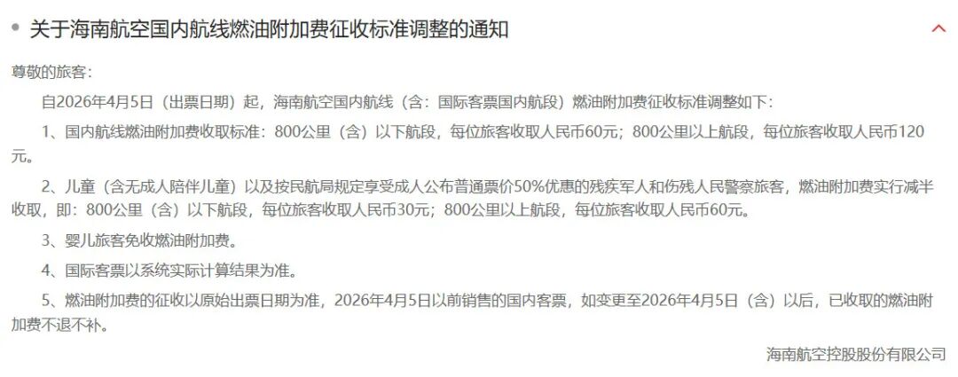 自2026年4月5日(含)起销售的客票,国内航线旅客运输燃油附加费收取标准调整为: