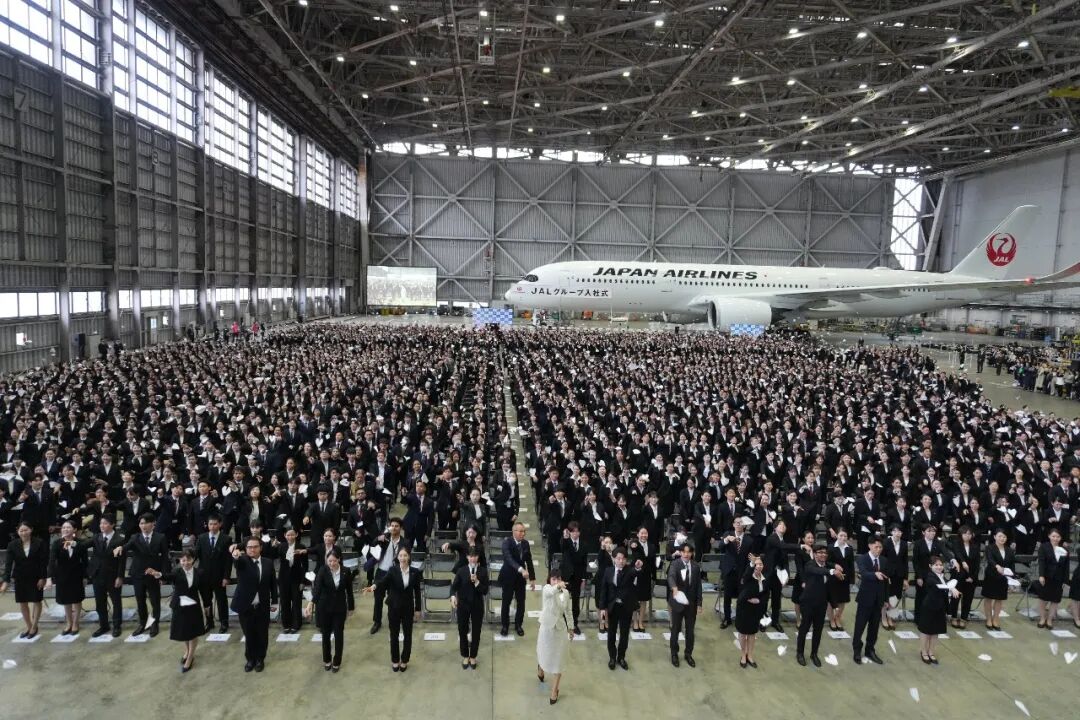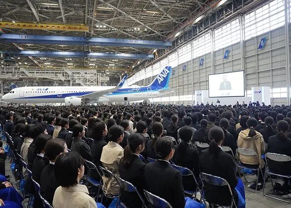 2026年4月1日,日本两大航空巨头日本航空(JAL)与全日空航空(ANA)分别在羽田机场的飞机维修机库内举行了入职仪式,迎接新员工。