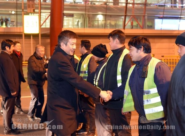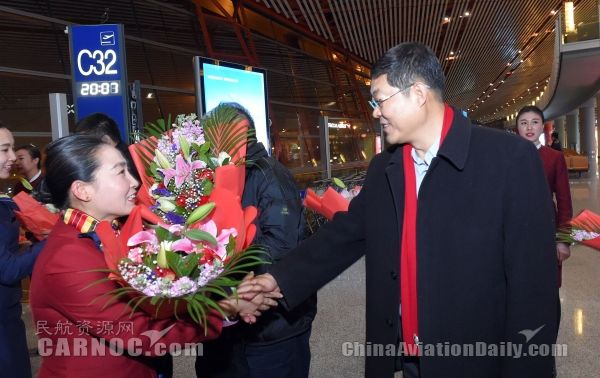 图:国航股份副总裁柴维玺迎接机组归航