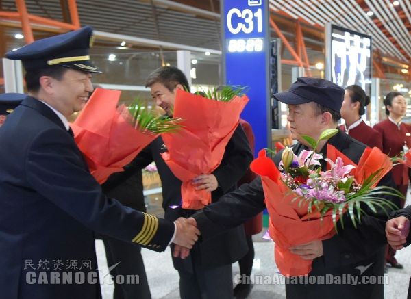 民航资源网2018年1月1日消息:2017年12月31日晚,随着北京总部、分公司、投资企业的航班陆续回到首都机场,中国国际航空公司顺利实现2017飞行安全年。早已在现场等候多时的中航集团(国航股份)董事长、党组(党委)书记蔡剑江,中航集团(国航股份)总经理(总裁)宋志勇,副总经理(副总裁)冯刚,国航股份副总裁柴维玺、刘铁祥等在京领导,向归航机组和执行保障任务的机务人员、地服人员送上鲜花和祝福,在喜庆氛围中共贺2017飞行安全年。