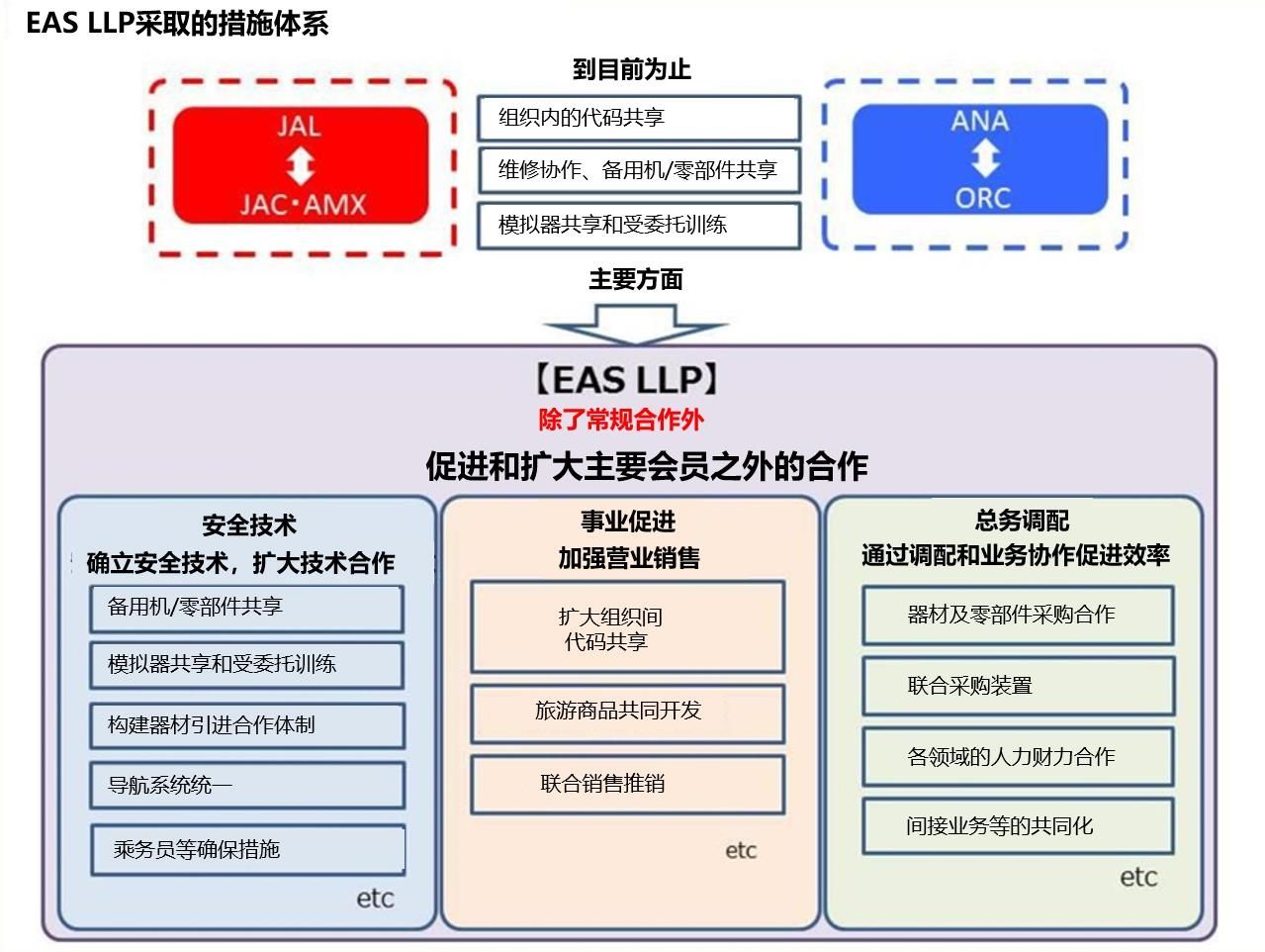 下图显示了EAS LLP的主要措施与体系。五名成员分成两个小组,日本航空、日本通勤与天草航空为一个小组,全日空与东方空桥为一个小组。EAS LLP负责安全技术及销售方面的改进,促进采购效率以及业务通用化和人员合作,而设备与航线计划则仍由航司像以前一样确定。